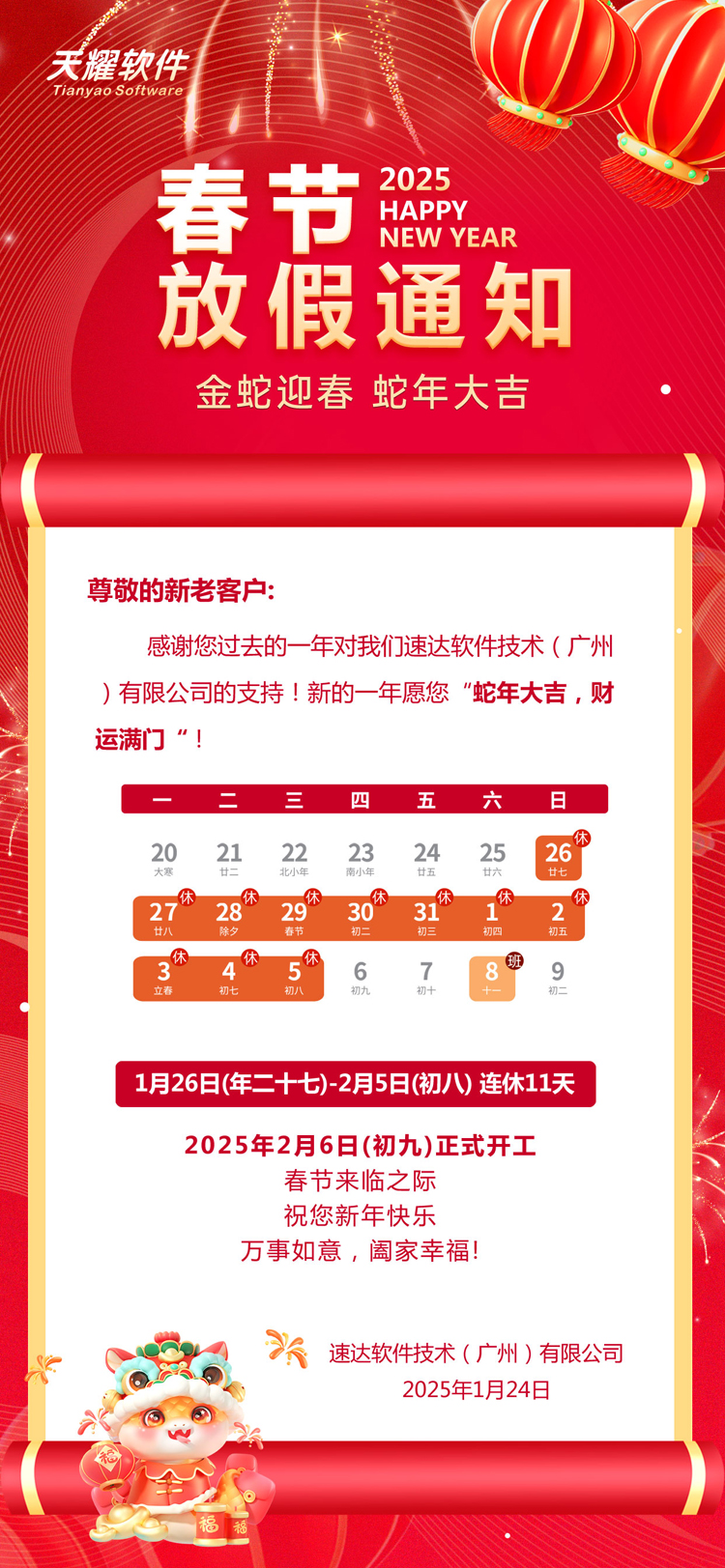 在这辞旧迎新之际,我们怀着无比感激的心情,向您致以最诚挚的谢意!感谢您在过去一年对速达软件技术(广州)有限公司的信任与支持。因为有您,我们才能在竞争激烈的市场中稳步前行,收获满满的成果。值此新春佳节到来之际,速达全体员工恭祝大家新年快乐、阖家幸福、万事如意!为欢度传统佳节,确保公司员工度过一个欢乐、祥和的新年,我公司春节放假安排如下: